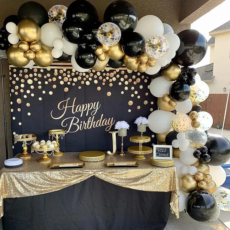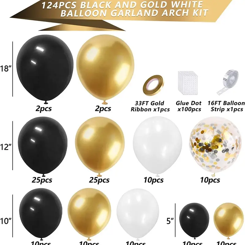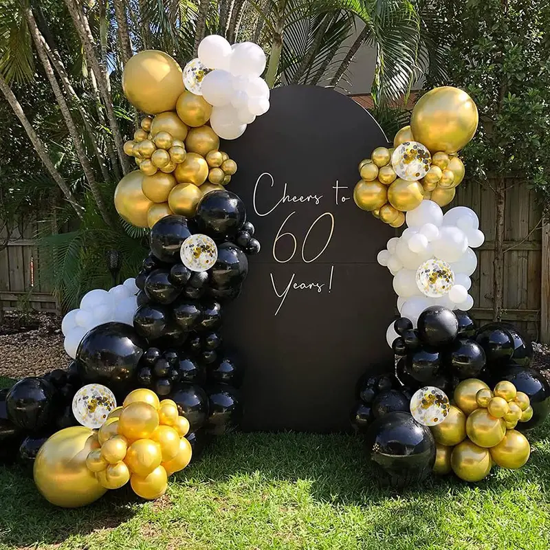 Make your celebration shine with the 124-Piece Black, Gold, and White Balloon Garland Arch Kit—the ultimate décor for a luxurious and unforgettable event!