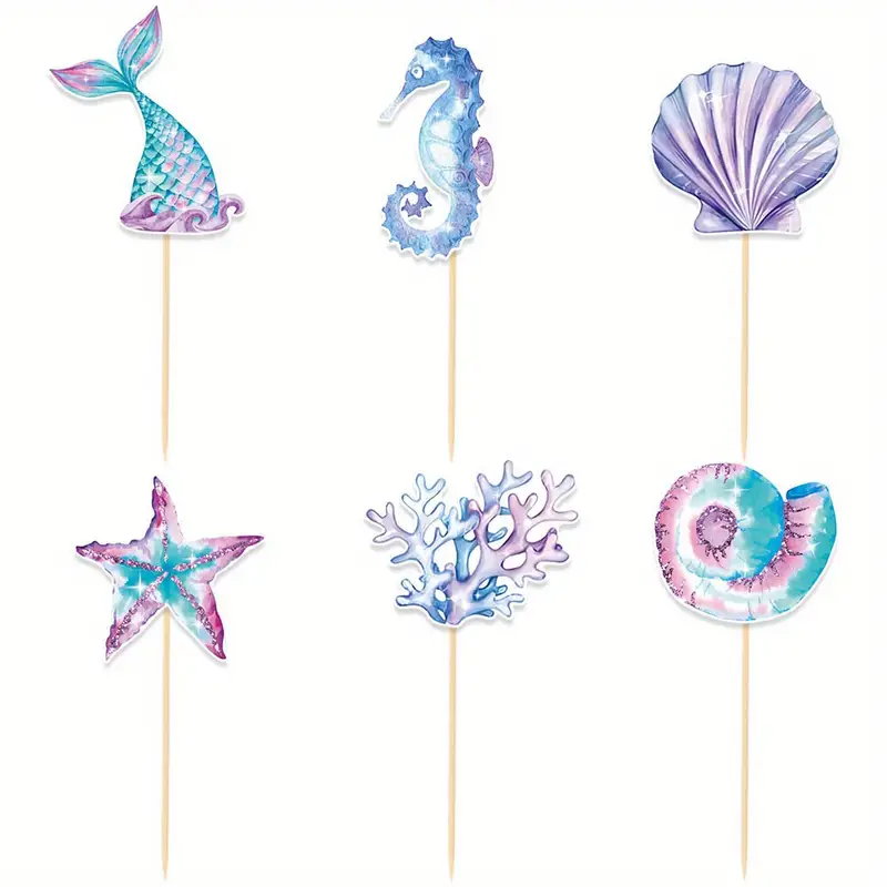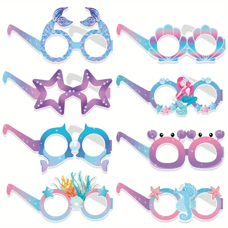 The set includes a three-tiered cupcake stand, eight wall decorations and ceiling twirls, six pairs of under-the-sea-themed glasses, 6″ lettering to spell “Happy Birthday”, six mermaid themed headbands, and six cupcake toppers