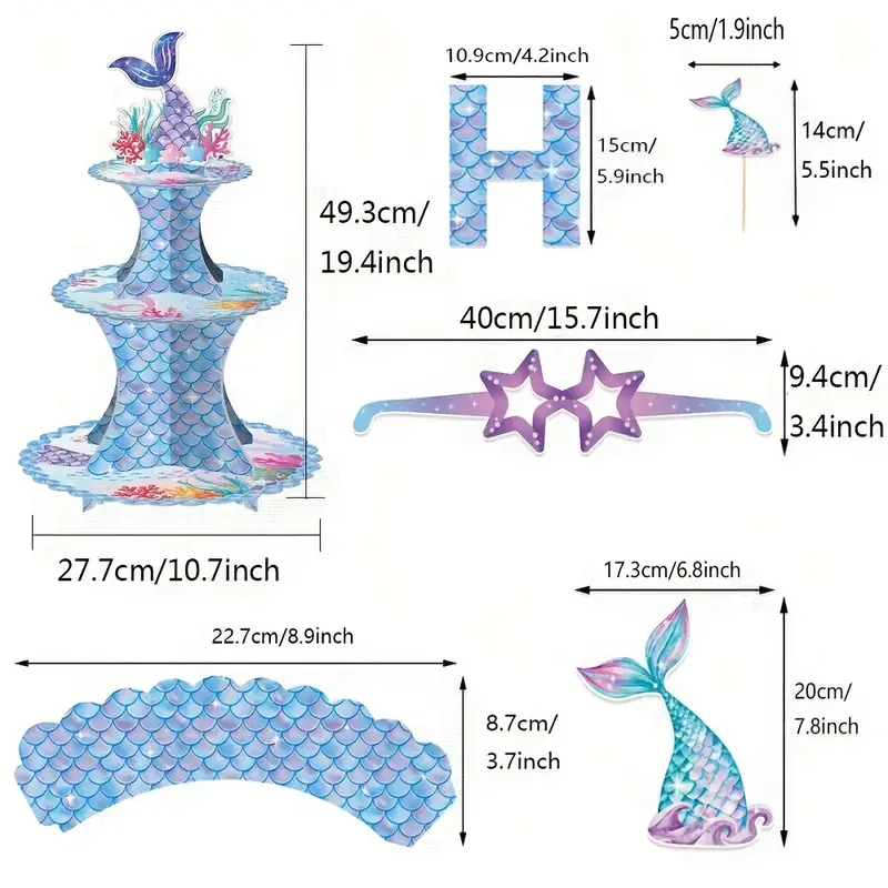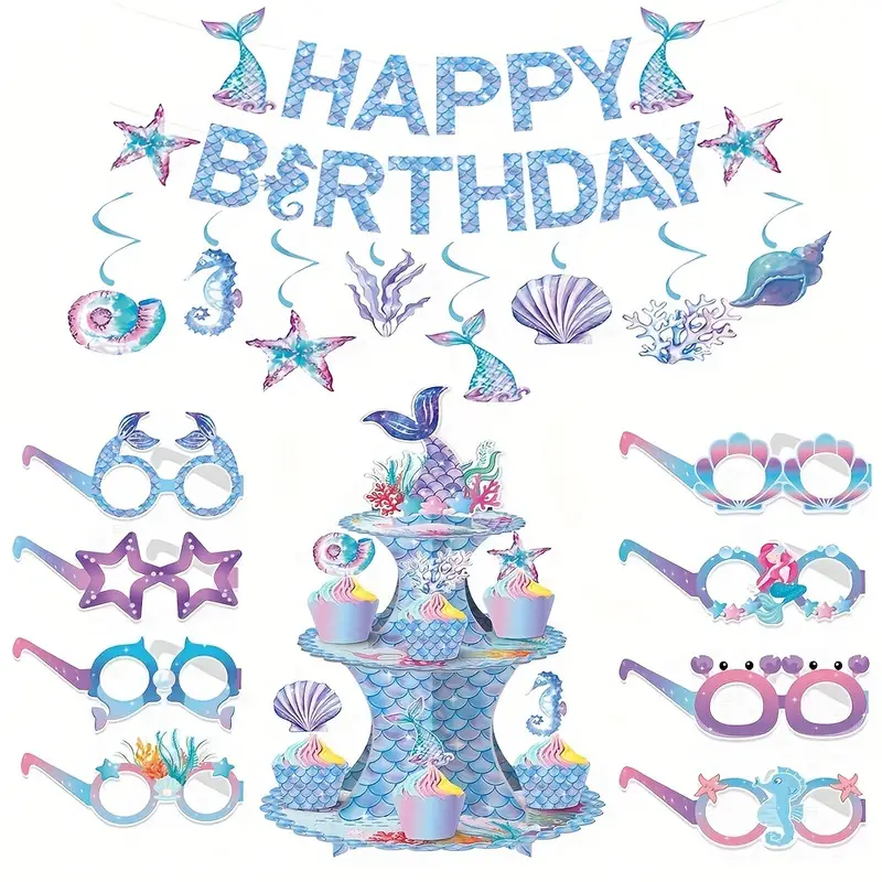 Mermaid Party Supplies Kits With Happy Birthday Banner, Hanging Swirl, Cupcake Stand, Cupcake Toppers, Cupcake Wrappers, Paper Glasses For Baby Shower Birthday 1st Birthday Supplies